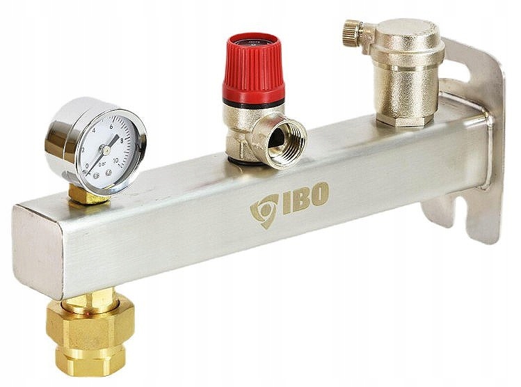 Grupa bezpieczeństwa IBO INOX to urządzenie służące do montażu naczynia przeponowego oraz mające na celu kontrole i zabezpieczenie przed nadmiernym wzrostem ciśnienia w instalacji grzewczej. Grupa bezpieczeństwa jest wyposażona w manometr, odpowietrznik automatyczny, zawór bezpieczeństwa oraz zawór serwisowy.