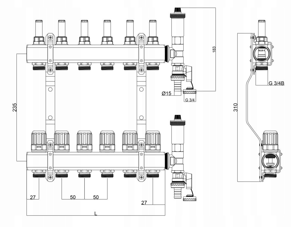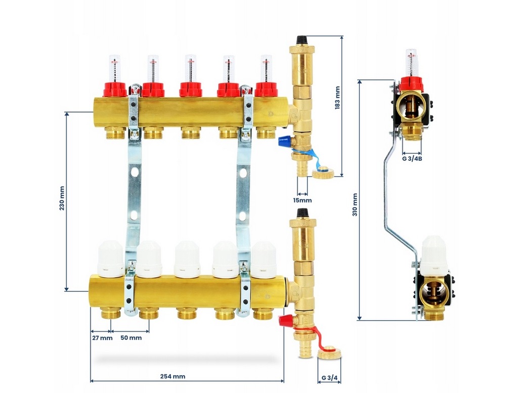 Rozdzielacz wykonany jest z belek mosiężnych o średnicy gwintu 1″, w których w dolnej części zamontowane są nyple rozdzielacza 1/2″ x 3/4″ do złączek zaciskowych, a w górnej części przepływomierze i zawory (wkładki termostatyczne) z przyłączem do siłowników elektrotermicznych lub termostatów z kapilarą. Wymiar przyłącza do siłowników wynosi M30 x 1.5, jest to najpopularniejszy rozmiar przyłączy, który wykorzystują takie firmy jak Heimeier, Honeywell, Oventrop i inne.